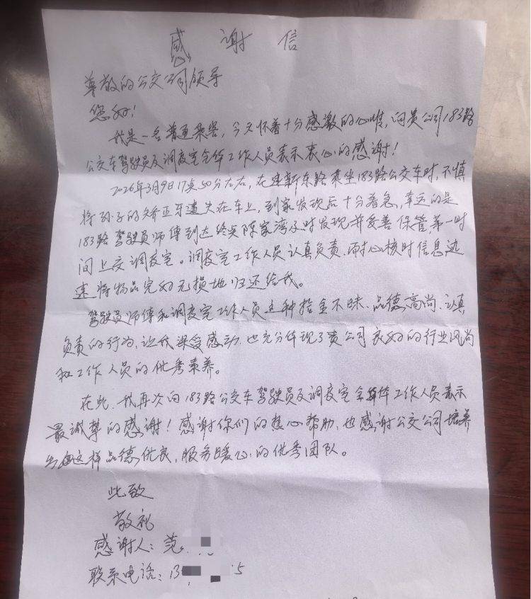 “驾驶员和工作人员这种拾金不昧、认真负责的行为,让我深受感动……”近日,一封字迹工整的手写感谢信送到重庆公交183线的调度室里,写感谢信的是乘客范大爷,他带着孙子乘车时,不慎丢失孩子的定制矫正牙套,幸好被驾驶员和工作人员寻回,他特地手写感谢信送到调度室。